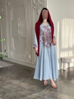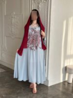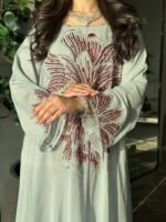 لبسة راقية مصممة من قماش الدبل شيفون الخفيف والناعم، مزينة بشغل شك أنيق يضفي لمسة من البريق والأنوثة، تُرافقها شيلة متناغمة لإطلالة متكاملة وأنيقة.