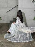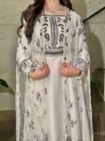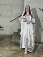لبسة فاخرة مكونة من قطعتين بتصميم يجمع بين الدانتيل الفرنسي الراقي وقماش الكاندي كريب الانسيابي، مزينة بتفاصيل شك أنيقة تضيف لمسة من الفخامة، تُرافقها شيلة متناغمة لإطلالة متكاملة ومميزة
