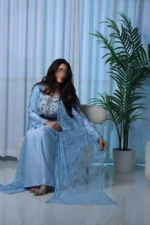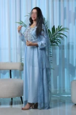 لبسة مكونة من قطعتين بتصميم أنيق يجمع بين قماش الكاندي كريب الانسيابي والدانتيل الفرنسي الفاخر، مزينة بشغل شك دقيق يضيف لمسة فخمة وراقية، مثالية للمناسبات الخاصة والإطلالات المميزة.