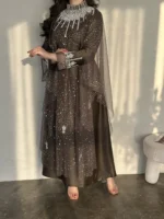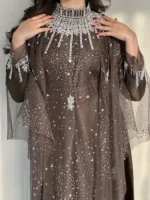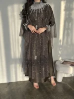 لبسة بطبقتين من التور الفاخر بتدرجات وتصاميم متنوعة، مزينة بشغل شك متقن يضفي لمسة من التألق والفخامة، تصميم أنثوي أنيق يناسب المناسبات الخاصة والإطلالات المبهرة.