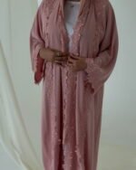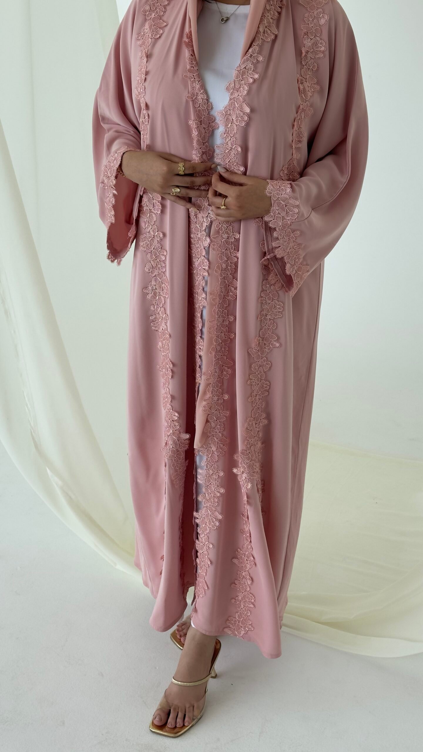عباية صيفية أنيقة مصممة من قماش ندى الخفيف والناعم، مزينة بدانتيل راقٍ يضفي لمسة أنثوية فاخرة